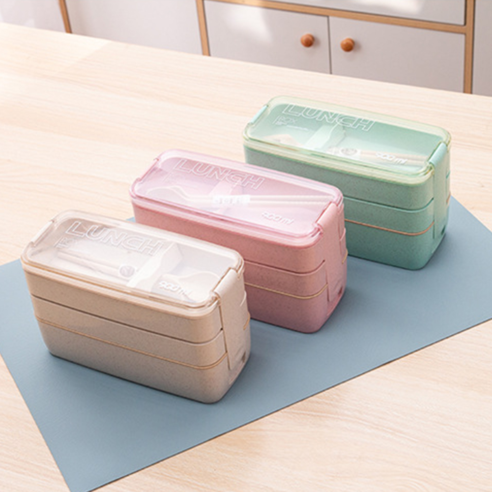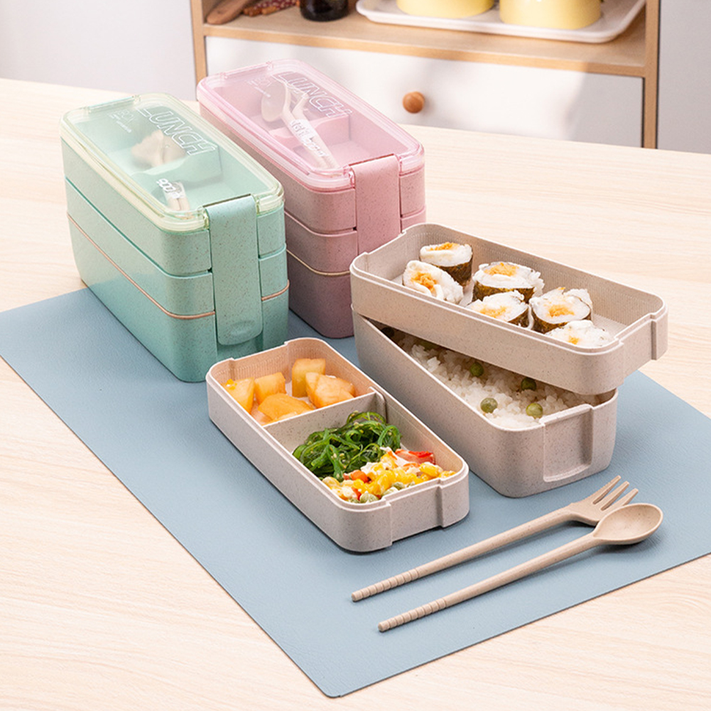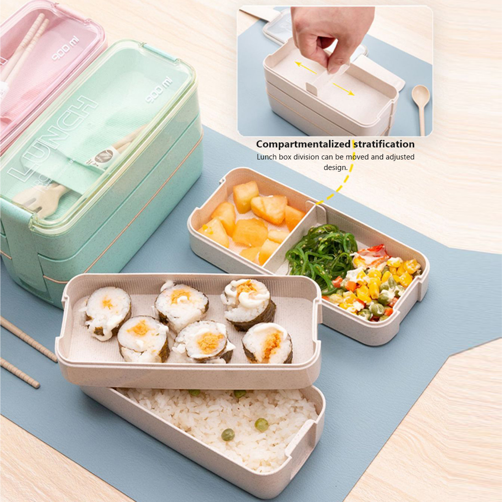• Stackable Bento Box 3 Layer Lunch Box With Fork And Spoon 3 Grid Design Detachable Compartment Tray Rectangular Lunch Box Kit For Boys Girls Children 3-layers pink (900ml)