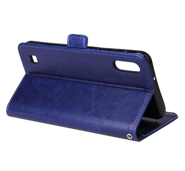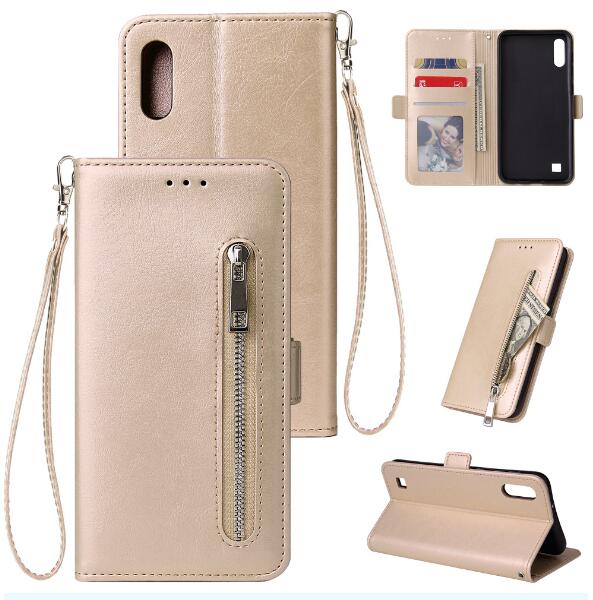 Abctay Solid Color PU Leather Zipper Wallet Double Buckle Protective Case with Stand & Lanyard gold For Samsung A10