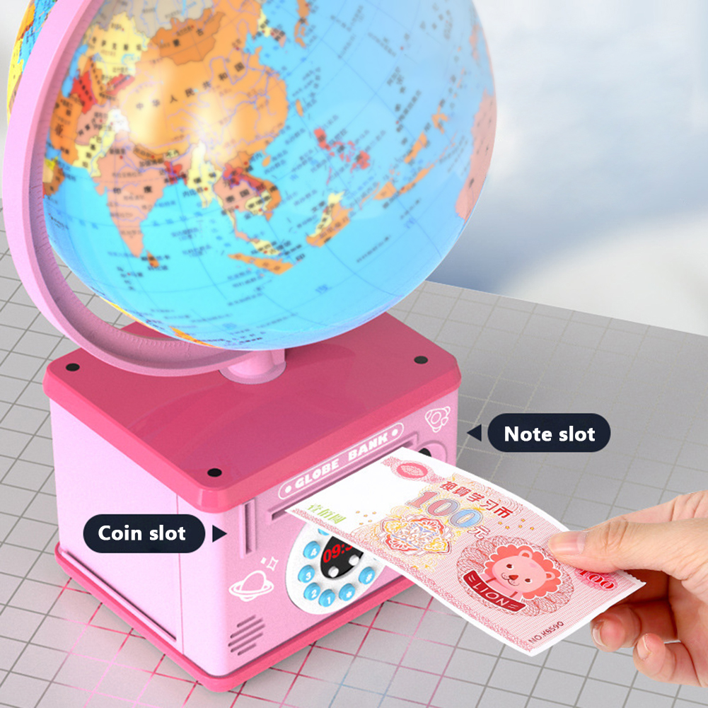 • Children Globe Shape Piggy Bank Password Money Box Cash Coin Savings Box with Night Light Music Pink