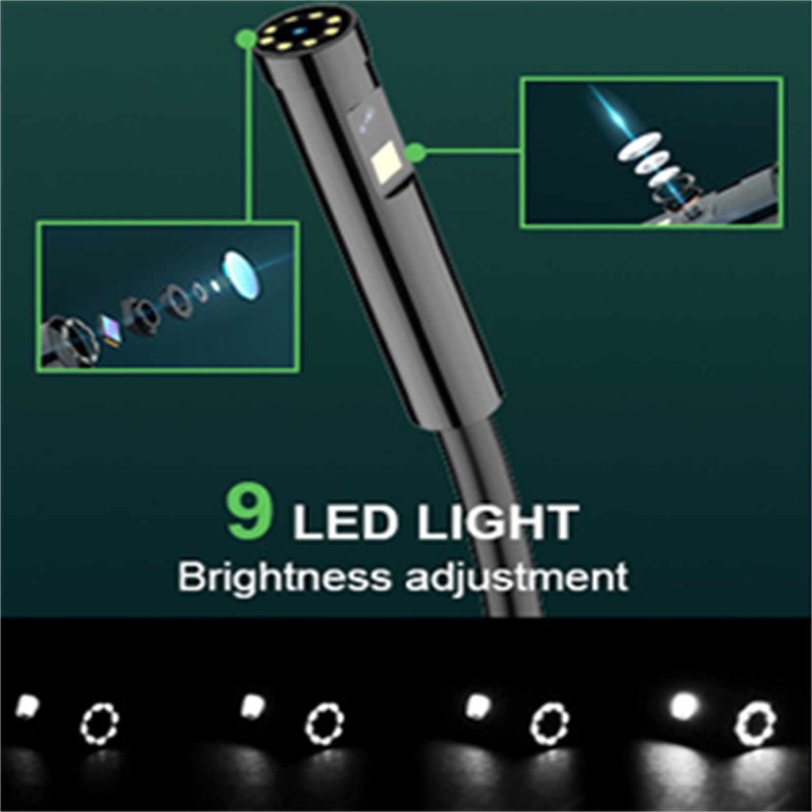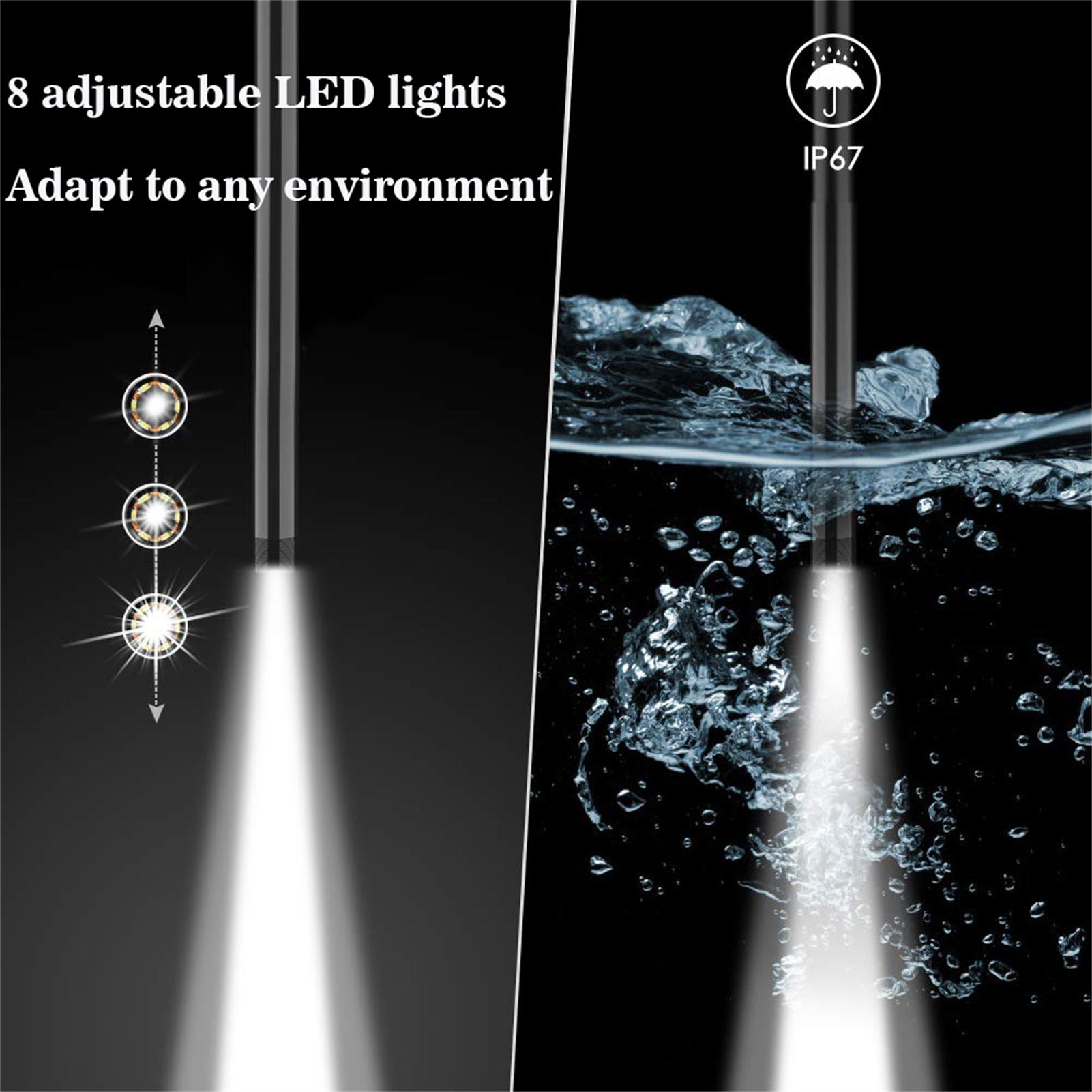 IP67 Waterproof & LED Lights: The endoscope camera is equipped with 8 ultra-bright LED lights with 3 adjustable brightness levels, ensuring optimal visibility. The camera probe and LED lights have IP67 waterproof capabilities.