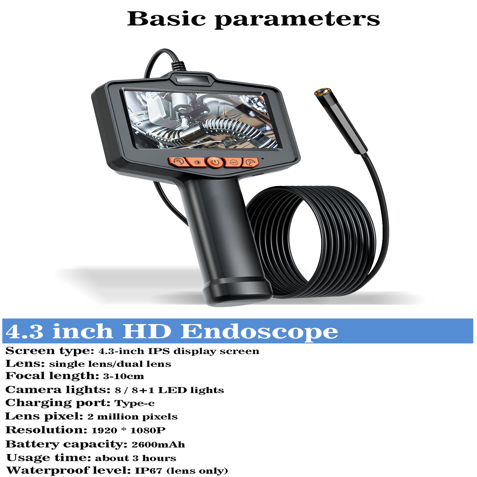 4.3-Inch LCD Display: This high-definition endoscope camera features a 4.3-inch color LCD display, allowing real-time viewing of high-definition images. It is easy to operate and ready to use immediately after powering on.