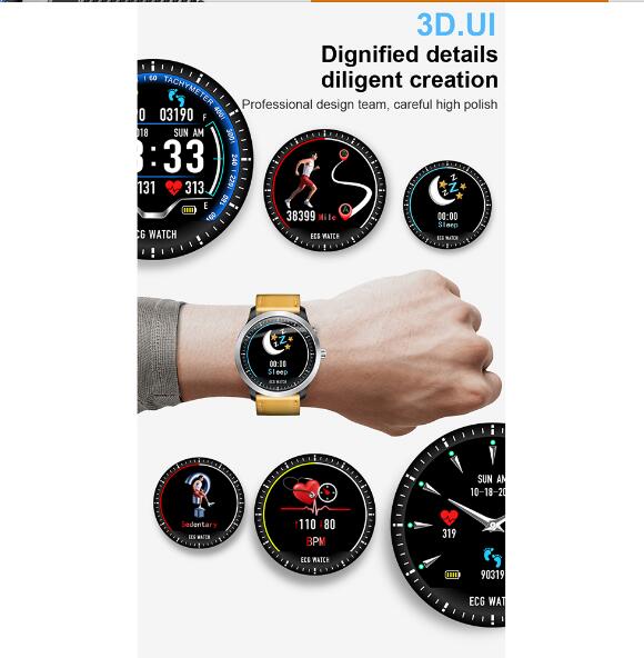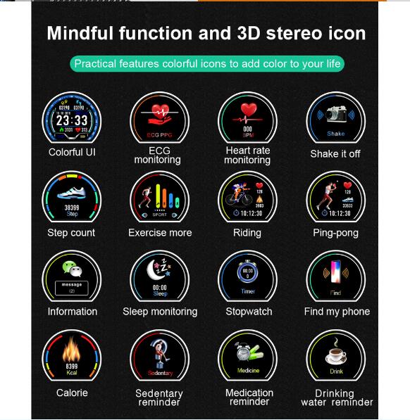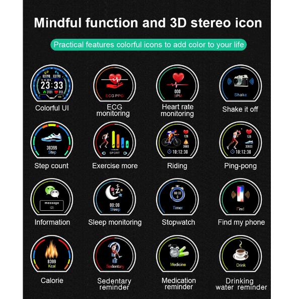 • Function: heart rate detection, ECG measurement, time display, step counting, calories, distance, heart rate, sleep time, on/off display, standard motor function (step, distance, calories), sleep monitoring (sleep time, sleep quality), incoming call Notification, message reminder, multi-language push, alarm reminder, task reminder (seize reminder,), sync data to APK/APP
