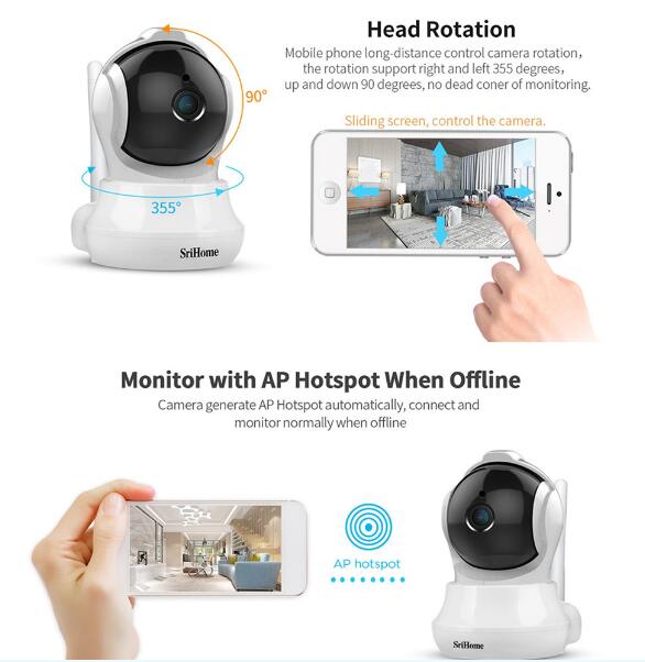 Mobile phone long-distance control camera rotation, the rotation support right and left 355 degrees, up and down 90 degrees, no dead corner of monitoring.