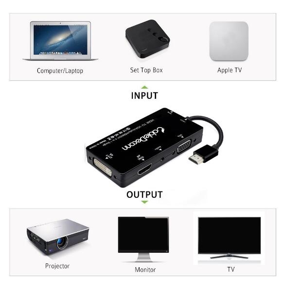 The HDMI to HDMI VGA DVI 3.5mm Audio Micro USB Adapter is compatible with SetTop Box,Computers/Laptops and most of HDMI Input Devices,and also compatible with Monitors/Projectors/Tvs as output devices which are equipped with HDMI VGA or DVI Port.